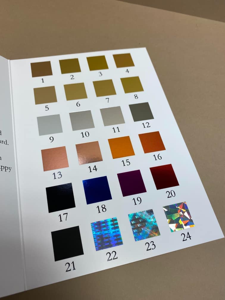 The inner leaves showcase just some of the basic foils we can offer in house along